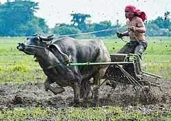 Carabaos are mainly used as draft animals for paddy field rice cultivation. In 2023, the vast majority of Philippine carabaos (99.3%) are raised for this purpose by smallholder farmers.[3][18] Carabaos raised as draft animals are typically docile and can be trained with simple commands. They are treated as a family pet and are regularly taken to bodies of water to bathe when not working.[19][20] The advent of modern machinery like tractors are slowly displacing carabaos in their role as draft animals.[21][22]