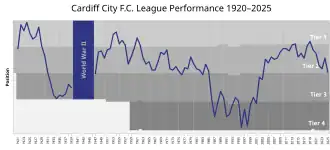 Cardiff City Football Club (Welsh: Clwb Pêl-droed Dinas Caerdydd[3]) is a professional association football club based in Cardiff, Wales. It currently competes in EFL League One, the third tier of the English football league system in the 2025–26 season following relegation. Founded in 1899 as Riverside A.F.C., the club changed its name to Cardiff City in 1908 and entered the Southern Football League in 1910 before joining the English Football League in 1920. The team has spent 17 seasons in the top tier of English football, the longest period being between 1921 and 1929. Their most recent season in the top flight was the 2018–19 Premier League season.