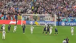 Despite Messi's individual form, Barcelona's four-year cycle of success under Guardiola – one of the greatest eras in the club's history – drew to an end.[102] Although Barcelona won the 2012 Copa del Rey final 3–0 against Athletic Bilbao on 25 May, its 14th title of that period, the team lost the league to Real Madrid and was eliminated in the Champions League semi-finals by the eventual champions, Chelsea, with Messi sending a crucial second leg penalty kick against the crossbar.[103][104] In Barça's last home league match on 5 May, against Espanyol, Messi scored all four goals in a 4–0 win before approaching the bench to embrace Guardiola, who had announced his resignation as manager.[105] He finished the season as league top scorer in Spain and Europe for a second time, with 50 goals, a La Liga record, while his 73 goals in all competitions surpassed Gerd Müller's 67 goals in the 1972–73 Bundesliga season, making him the single-season top scorer in the history of European club football.[106][107]