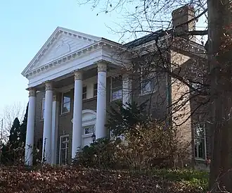 Prominent Peoria architectural firm Hewitt & Emerson designed the Classical Revival house;[3] the style was in vogue in the early twentieth century, mainly due to its use at the 1893 Columbian Exposition. The front entrance features a full-height porch topped by a pediment and supported by four Corinthian columns and two Corinthian pilasters. The entrance itself is flanked by Ionic pilasters and topped by a fanlight and dentillated segmental pediment. The south and east sides each feature porches with Doric columns and balustrades.[2]