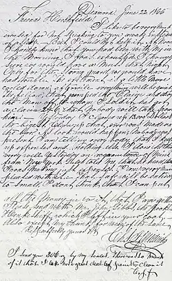 Friedrichs mentioned in a letter dated 26 August 1866 to Hershfield, that they arrived safe and sound in Fort Benton, haven't seen any road agents and that they tomorrow want to leave there in Mackinaw boats down the Missouri towards Cow Island (where the steamship Luella with Captain Grant Marsh (1834–1916) was waiting for them).[14][15][16]