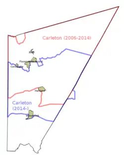 The electoral districts of Carleton (2006-2014) and Carleton (2014-) as they relate to Carleton County and its municipalities.