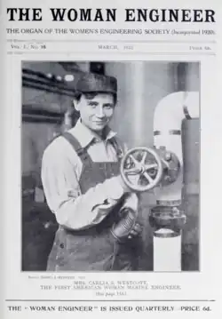 Carlia S. Westcott was an American engineer. She was the first woman to receive a first-of-a-kind license in Marine Engineering in the United States, in December 1921.[1] She was highlighted on the cover of The Woman Engineer after the New York Times covered her. She was from Seattle, Washington.[1][2][3][4][5] She was married to the chief engineer of the Cary-Dan's Towing Company who worked on one of the tugboats in the Seattle region.[1] Carlia assisted her husband on one of the vessels. There she carried out the tasks of a fireman.