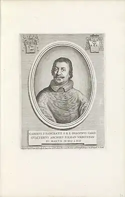 Carlo Gualterio was created cardinal deacon in the consistory of 2 March 1654 by Pope Innocent X and opted for the deaconry of S. Pancrazio. From 1672 to 1673 he was Camerlengo of the Sacred College of Cardinals.