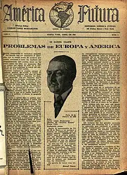 Carlos López Bustamante's long exile made him one of the leading voices in the struggle against Gómez overseas. For nearly twenty years he was one of the leading figures of the resistance in exile. He used his pen and his knowledge of journalism, printing and publishing, to reveal to the world the horror of tyranny in Venezuela. For this he created his own printing press in New York City, "Carlos López Press", where he began publishing the famous magazine "Venezuela Futura" in opposition to Gómez. Many writers who had escaped from the prisons of the dictatorship collaborated on this magazine, including his relatives Rafael Bruzual López and Nestor Luis Pérez Luzardo. In 1934 the magazine's name was changed to "América Futura" with a message directed to Hispanic America to achieve the consolidation of democracy in the continent.[16][17]