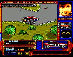 Carlos Sainz shares the same isometric perspective as Sito Pons, allowing the team to adequately simulate car movement, as well as easing composition of curves and giving a greater sense of speed unlike several racing simulation titles that made use of different perspectives.[3][6] However Antonio Carrera Merino stated that the graphics proved time-consuming and difficult due to the vehicle having 360 degree movement, requiring help to create the graphics and opting for digitization.[15][16] Saiz also stated that working with terrain effects like skids and jumps proved complicated, while designing courses was a complex issue as well due to memory constrains and the number of maps needed to be implemented.[16] Saiz claimed that the game made use of variables to make driving realistically accurate as possible, with Zigurat providing documentation of car behavior to Arcadia in order to program the driving physics.[14] Saiz also claimed that the title used streaming code that modified driving physics depending on the conditions.[14] Both Zigurat and Arcadia spent many testing hours prior to launch, with Rada polishing the driving physics at Arcadia.[10][12][14]