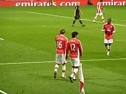 Vela made his competitive debut for Arsenal on 30 August 2008 in their Premier League match against Newcastle United, coming on as a substitute for Robin van Persie in the 63rd minute. Arsenal won the match 3–0. In his full debut on 23 September 2008, against Sheffield United in the League Cup, Vela scored a hat-trick in a 6–0 win, with his second goal voted as one of Arsenal's Greatest 50 Goals.[18] The match was also notable for featuring Arsenal's youngest ever side, with an average age of 19.[19]