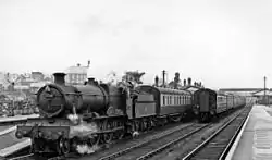 The present station is the third to serve the town and dates from 1902,[2] although the South Wales Railway's main line from Swansea to Neyland reached Carmarthen some fifty years earlier. This original station had been built with westward expansion in mind and was situated at the base of the triangular junction, half a mile south of the present station and poorly sited for the town.