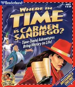 Carmen Sandiego's Great Chase Through Time (previously Where in Time Is Carmen Sandiego? and sometimes given the subtitle v3.0) is a 1997 edutainment point-and-click adventure game developed by Broderbund for Microsoft Windows and Macintosh devices. The game is a remake of the 1989 time-travel title Where in Time Is Carmen Sandiego?, making it the second Time video game in the Carmen Sandiego franchise. The game was strongly influenced by the short-lived PBS game show, Where in Time Is Carmen Sandiego?. The game was previewed at the 1997 Toy Fair in New York City.[3] A demo version was included on the CD for Carmen Sandiego Word Detective and was available on the Carmen Sandiego website.[4] After Broderbund was sold to The Learning Company, the game was re-released with a new title – Carmen Sandiego's Great Chase Through Time – but with minimal redesign.[5]