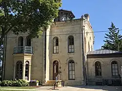 Some architectural historians have classified the house's style as Romanesque Revival. Others have placed it in the Rundbogenstil category, which means "round arch-style" and is an eclecticizing variation of Romanesque Revival originating in Germany.[4] It is characteristic of this style that many of the windows have round-arched frames within larger arches. At the top of the second story are ranks of fine dentils, also a hallmark of Rundbogenstil. The Italianate belvedere above the center flat bay reflects the style's indebtedness to Tuscan architecture.[5]