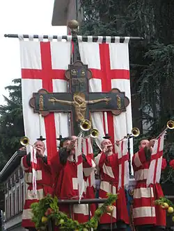 The carroccio, which has Lombard origins, was initially used by Arimannia as a war chariot.[4] Its function became purely symbolic,[5] with the addition of the cross, of the city signs, of the altar and with its preservation in the main church of the city[6] between 1037 and 1039 due to the Archbishop of Milan Aribert's use in one of the sieges that Conrad II, Holy Roman Emperor did on several occasions in Milan.[7][8] The carroccio therefore, from a military means, became a purely political instrument.[6] From Milan its use spread in many municipalities of northern Italy, in Tuscany and outside Italy, until the decline in the 14th century. Medieval documents show the carroccio called carochium, carozulum, carrocerum or carrocelum, while in the Milanese dialect of the time it was probably called caròcc or caròz.[9] The carroccio was introduced by Heribert (Ariberto) for use as the military insignia of Milan. His many supporters adopted and spread the use of the insignia. It was soon adopted in Lombardy, Tuscany and Rome where it signified a militia aligned toward a defence of the Church.[10][11]