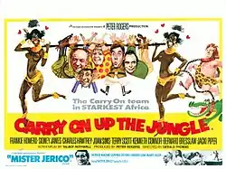 Carry On Up the Jungle is a 1970 British adventure comedy film, the 19th release in the series of 31 Carry On films (1958–1992). The film marked Frankie Howerd's second and final appearance in the series. He stars alongside regular players Sid James, Charles Hawtrey, Joan Sims, Terry Scott and Bernard Bresslaw.[1] Kenneth Connor returns to the series for the first time since Carry On Cleo six years earlier and would now feature in almost every entry up to Carry On Emmannuelle in 1978. Jacki Piper makes the first of her four appearances in the series. This movie is a send-up of the classic Tarzan films. It features an unusually dark tone for the series, as the protagonists are faced with certain death after they are apprehended by a cannibalistic tribe in the jungle. The film was followed by Carry On Loving (1970).