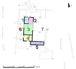 The villa contains a main house, a bathhouse, a courtyard, and a number of outbuildings. [1] The main house is 28 meters long by 9 meters wide, forming an area of 252 square meters (around three times the size of a modern house). The bathhouse, attached to the south-east corner of the main house, is 13.5 meters long and 4 meters wide, adding another 54 square meters to the structure. The villa was built on a platform raised above the surrounding fields, presumably to keep it dry. The main house has a verandah on the west side which would catch the evening sun in the summer.