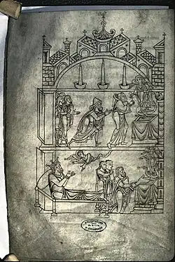 The original cartulary of the manuscript, dated to the middle of the 12th century, is decorated with several ornate initials: they are placed at the beginning of each charter. The letters are very little varied, as it is most often an "I" or "L", but each letter has a different decoration. The initials of the oldest part are black in colour, and contain fantastic animals mixed with interlacing: unicorns, billy goats, owls and werewolves, inspired by Physiologus or by folklore. Other initials are blue or red.[5] The manuscript also contains four miniatures covering all or most of their page:[6]