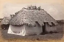 To establish a stronger connection with the posts, green branches are used since they contract during the drying process. At times, these branches are secured using fibers from a creeping plant called Warero (Cissus verticillata)[12] or from the Sisal plant (agave sislana) to enhance their durability.[8] The weaving was then sealed on two sides with this so-called, torto, composed of loam mixed with dried fibers of para grass. Once dried, the walls were finished by applying a layer of white lime. Sometimes, a yellow color was achieved by incorporating ochre to the lime paste. Aloe sap was also added to this mixture to enhance the lime layer's resistance to weather conditions.[2] The floors were covered with a layer of torto, preferably blended with the traditional cement of old times, namely cow dung.[13]