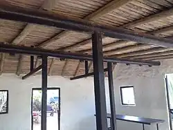 Wood pieces are placed atop of the poles to support the roof beams. Roofs were commonly constructed using maishi chiki (Sorghum bicolor), signalgrass (Brachiaria mollis), palmtree leaves (Arecaceae), or maize stems, locally referred to as chosa (before c. 1815).[15] This type of roofing is still found in Curaçao and Bonaire. Another method of roofing came in fashion in Aruba (after c. 1815), namely the whitening of these torto roofs. This method appears to have been introduced by groups of Spanish refugees who were expelled from Venezuela during the Venezuelan War of Independence and settled in Aruba.[1][13] These turtle-shaped roofs completely replaced the roofs covered with maize stems and are unique to these islands. To support the roof, roof rafters were installed on each pair of wall uprights, with a ridge height of approximately 1.20 metres (3.9 ft) and a roof pitch of around 50°. Fibrous skeletal strips of the candelabra cactus (Cereus repandus)[16] were utilized as roofing material. These cacti strips were either directly attached one by one to the rafters or first bound together with rope to create mats, which were then secured to the roof rafters. The outer surface of this cacti roofing was finished with the same torto used for the walls, and a final layer of white lime was applied.[13]