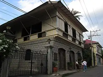 The house is a typical three-bayed bahay na bato. Its ground-floor walls of adobe blocks support an upper story of carved acanthus consoles of molave seemingly supporting the window sills. The ventanillas or "little windows" beneath the window sill are typical of the 1850s. The ogee arches carved on the doors were inspired by the facade of Bauan Church, where it first appeared in Batangas. The doors of the central bay lead to a short flight of stairs to the meseta (landing) with doors opening to the entresuelo (mezzanine chamber) that had capiz windows opening to the zaguan and a window on the street side with a wrought iron rejas na buntis. From the meseta, a flight of balayong stairs led to the wide caida with its panoramic view of Balayan Bay.[1]