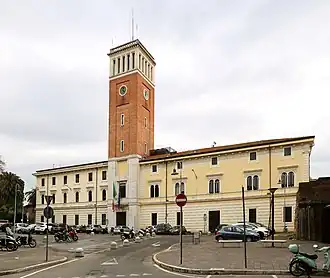 The building acquired its final form in 1939 when a new wing was constructed to unite the two original structures, crowned by a monumental tower in Rationalist style, created by Ugo Giovannozzi.[2] Between 1939 and 1941, a segment of the city walls was demolished, integrating the structure more seamlessly with the Piazza del Popolo, which was then dedicated to the "Martyrs of Fascism".[1][3]