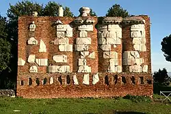 The structure is found at approximately the VIth mile of the ancient Appian Way. The name comes from the fact that the tomb is round and because a farmhouse (casale) was built on the top in the Middle Ages, when it belonged to the Savelli family and was one of a system of watchtowers along the Appian Way. The mausoleum dates from around 30 B.C.E. It is a large circular building with a diameter of 35 m, decorated with a frieze and, originally, had a cone-shaped roof. The base offered seats where travellers could rest out of the sun. Near the mausoleum, the archaeologist Luigi Canina (1795-1856) built a brick wall containing architectural fragments. These were originally thought to have been from the Casal Rotondo but this is now disputed.[2] Canina deduced from a small piece of inscription with the name "Cotta" that the monument had been built by M. Aurelius Cotta Messallinus for his father, Marcus Valerius Messalla Corvinus, but this inscription and other architectural fragments are now assumed to have come from a smaller monument at the site, and they may have nothing to do with Messalla Corvinus.[3][4]