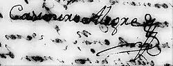 His father Matías Alegre Paredes, was a cattle breeder settled with his wife in the area of Zárate since 1724.[18] Casimiro Alegre was baptized on April 19, 1741, in the Parish San Nicolás de Bari, being his godparents Ramón López de Osornio and Margarita Sosa, a distinguished family of ranchers related to Clemente López de Osornio.[19] He was married to Anastacia Espinosa,[20] daughter of Francisco Antonio Espinosa and Francisca Ramírez,[21] a Creole woman genealogically related to the families of Garay and Peñalba.[22]