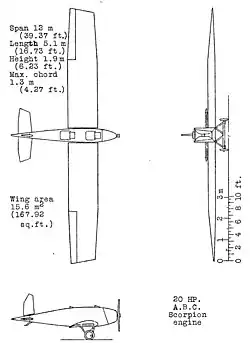 • Powerplant: 1 × ABC Scorpion air-cooled flat twin, 22 kW (30 hp) maximum, at 3,200 rpm