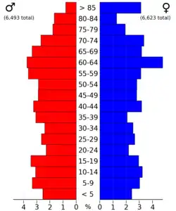 In the county, the population was spread out, with 23.80% under the age of 18, 6.80% from 18 to 24, 24.80% from 25 to 44, 23.80% from 45 to 64, and 20.80% who were 65 years of age or older. The median age was 42 years. For every 100 females there were 94.30 males. For every 100 females age 18 and over, there were 90.20 males.