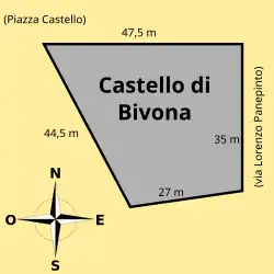 The layout of the castle has been determined from old maps of Bivona. Its dimensions were as follows, giving it an area of around 1,700 m2 (18,000 sq ft):[3]