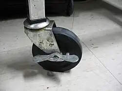 A basic, rigid caster consists of a wheel mounted to a stationary fork. The orientation of the fork, which is fixed relative to the vehicle, is determined when the caster is mounted to the vehicle.[1] An example of this is the wheels found at the rear of a shopping cart in North America. Rigid casters tend to restrict vehicle motion so that the vehicle travels along a straight line.