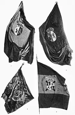 -1. War flag that flew in the castle of San Cristóbal, on May 12, 1898. Nº 3.471 of the Artillery Museum Catalog.-2. War flag that flew at the Morro Castle, on May 12, 1898. Nº 3.472 of the Artillery Museum Catalog.-3. Banner of the 12th artillery battalion, whose force covered the batteries of San Juan during the battle of May 12, 1898. Nº 3.466 of the Artillery Museum Catalog.-4. Flag of the Mayagüez Volunteers battalion. Nº 4.972 of the Artillery Museum Catalog.