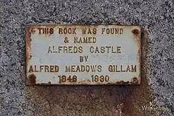 Castle Rock is a tourist attraction in the Porongurup Range in the Great Southern region of Western Australia and is renowned for its fauna and flora. The rock formation was once named "Alfred's Castle" and, until 2012, bore a plaque (see image) stating that it was discovered by Alfred Meadows Gillam. Alfred Meadows Gillam "established a transport business at Katanning and pioneered the transporting of provisions to Mt. Malcolm and Eastern Goldfields by the turn of the century, using wagons and camel teams before the railway was built".
