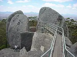 There is a walk trail to the summit which offers 360 degree views, 570 metres (1,870 ft) above sea level from a lookout known as the Granite Skywalk. The walk also takes in the unusual 'Balancing Rock', a 6-metre-high (20 ft) granite boulder which reportedly weighs around 186 tonnes (410 thousand pounds) yet rests on a base just 1.21 square metres (13.02 sq ft).[1]