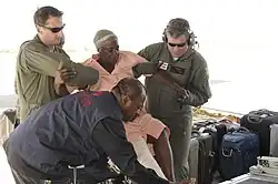 US Coast Guard personnel carry an injured woman onto the loading ramp of an HC-130 Hercules aircraft, 14 January 2010, before departing for the Dominican Republic.