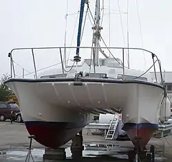 The Catalac company's main model was the 9-metre 9M. All the other models are derived from the 9M and use a similar design concept; the 8M even used the same hulls as the 9M.[2] All Catalacs were very strongly-built with thick grp hulls and glass windows. Some of the superstructure, such as the solid foredeck, was of sandwich grp construction. Compared to modern designs, Catalacs had a narrow beam of less than half the LOA,[3] and vertical transoms (rather than the more modern "sugar scoop" with transom steps). Initially featuring lifting dinghy-type rudders, Catalac moved to fixed rudders protected by a skeg; this allowed the boats to sail a little closer to the wind. Only the 9M has a staggered sheerline (which allows easy aft access from a pontoon); the other models all have an unbroken sheerline.