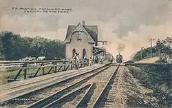 The Woods Hole Branch of the Old Colony Railroad opened in 1872. A station was open at Cataumet by 1879.[2][3][4][5] A new station building was constructed in 1883.[6] The gingerbread-style structure was destroyed by a fire in 1925 and subsequently replaced by a small brick structure which still stands today.[1] It was last used as a railroad station in 1988 by the Cape Cod & Hyannis Railroad.