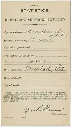 In September 1892, a doctor employed by the U.S. Pension Bureau examined Cathay Williams. Despite the fact that she suffered from neuralgia and diabetes, resulting in the amputation of her toes, and could only walk with a crutch, the doctor decided she did not qualify for disability payments. Her application was rejected.[3][4]