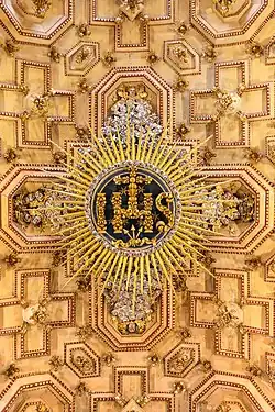 Barrel vaulted ceiling with emblem of the Jesuits at center