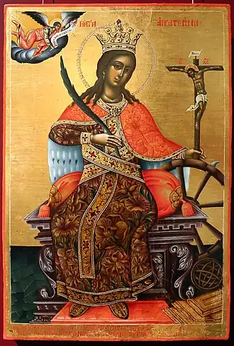 Catherine of Alexandria is a tempera painting created by Ioannis Kornaros. Kornaros was probably a monk in Crete during the period the Ottoman Empire occupied it from (1667–1898). He was a student of Georgios Kastrofylakas, and both painters were influenced by the late Cretan School. There were some painters residing in Crete after the Ottoman occupation, including Michael Prevelis. Oriental themes influenced some of Kastrofylakas' works. Both artists were part of the Greek Neoclassical era and the Modern Greek Enlightenment in art. One of Kornaros' most notable works is a painting entitled Great Art Thou (Megas Ei Kyrie). The painter was active in Crete, Mount Sinai, and Cyprus. He died the same year the Greek War of Independence began. According to the Institute of Neohellenic Research, forty-eight of his paintings have survived.[1][2]