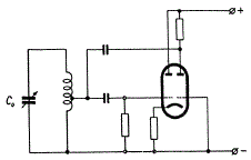 In the Cathode follower oscillator schematic, the long tail amplifier is connected to a tap of the LC-circuit inductance for a light load on the LC-circuit. A grid-leak couples the grid of the left triode to the LC-circuit. The left triode uses common anode circuit which has high input impedance, low output impedance and no voltage amplification. The long-tail resistor couples the two triodes. The right triode uses common grid circuit which has low input impedance, high output impedance and no current amplification. A capacitor at the anode resistor of the right triode couples the amplified signal back to the LC-circuit. At low frequency, both triodes have a phase shift of zero degree.