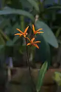 Cattleya cinnabarina is a lithophyte from Brazil, growing at intermediate elevations. The inflorescences emerge from the top of new pseudobulbs, each carrying a dozen or so bright orange flowers.