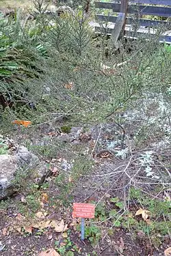 This shrub produces a highly branched, spreading stem up to about 1.5 meters tall. The evergreen leaves are alternately arranged and often borne in clusters. Each is under 2 centimeters long, toothed along the edges, wavy and turned under along the margins to appear somewhat ruffled. They are hairy and covered in tiny glandular bumps, the upper surfaces dark shiny green and the undersides paler. The inflorescence is a small cluster of many bright blue flowers. The fruit is a lobed, crested capsule about 4 millimeters wide.