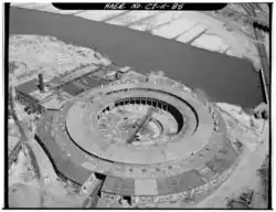 The site for the new expanded yard largely consisted of marshland, which complicated construction.[14] Over 3,000,000 cubic yards (2,300,000 m3) of fill was required for the project, which had to be delivered from cuts made elsewhere on the New Haven system.[14] In particular, the two humps had to be built on the previously flat land, with one of them being 30 feet (9 m) in height.[14] To accomplish this, trestles were built and then buried with fill, creating the hills needed for the humps.[14] Construction of the trestles required piles to be driven up to 60 feet (18 m) underground due to the soft soil.[14] For moving and transporting soil, the New Haven Railroad purchased 120 side-dump gondolas, and seven steam shovels worked to fill the side-dump cars at cut sites.[14] Locomotives backed trains of 15 gondolas at a time up the trestles, and dumped fill under them until the fill was level with the tracks, leaving the trestles covered by soil.[14]