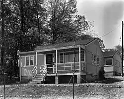 Cemesto was introduced by the Celotex Corporation in 1931. The John B. Pierce Foundation and Celotex collaborated to develop a prefabrication system for building low-cost housing using cemesto panels, in which single cemesto panels were slid horizontally into light wooden frames to create walls.[3][9] Prior to the adoption of cemesto to create prefabricated housing, most rationalized fabrication systems relied on vertical ceiling-height panels supported by a frame.[2] A prototype cemesto house was displayed at the 1939 World's Fair in New York City.[11] The Pierce system was first used in 1941 for building employee housing at the Glenn L. Martin Aircraft Company, near Baltimore, Maryland.[9][12] For this development, named Aero Acres, the architecture firm of Skidmore, Owings & Merrill designed gable-roofed Cape Cod houses with dimensions of 24 feet (7.3 m) by 28 feet (8.5 m), featuring large commercial-style windows in their principal rooms. In 1941, 600 homes were built at Aero Acres using this design.[3]