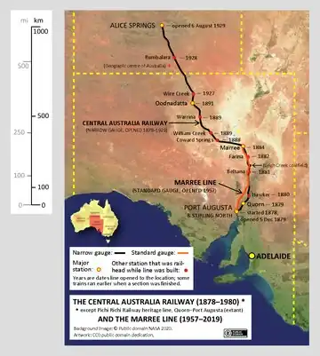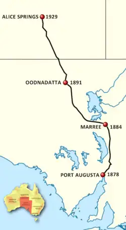 | Opened | Port Augusta–Marree: 1884 Marree–Oodnadatta: 1891 Oodnadatta–Alice Springs: 1929 | ||||||||||||||||||||||||||||||||||||||||||||||||||||||||||||||||||||||||||||||||||||||||||||||||||||||||||||||||||||||||||||||||||||||||||||||||||||||||||||||||||||||||||||||||||||||||||||||||||||||||||||||||||||||||||||||||||||||||||||||||||||||||||||||||||||||||||||||||||||||||||||||||||||||||||||||||||||||||||||||||||||||||||||||||||||||||||||||||||||||||||||||||||||||||||||||||||||||||||||||||||||||||||||||||||||||||||||||||||||||||||||||||||||||||||||||||||||||||||||||||||||||||||||||||||||||||||||||||||||||||||||||||||||||||||||||||||||||||||||||||||||||||||||||||||||||||||||||||||||||||||||||||||||||||||||||||||||||||||||||||||||||||||||||||||||||||||||||||||||||||||||||||||||||||||||||||||||||||||||||||||||||||||||||||||||||||||||||||||||||||||||||||||||||||||||||||||||||||||||||||||||||||||||||||||||||||||||||||||||||||||||||||||||||||||||||||||||||||||||||||||||||||||||||||||||||||||||||||||||||||||||||||||||||||||||||||||||||||||||||||||||||||||||||||||||||||||||||||||||||
