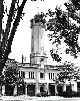 The building was built in 1912, designed by the British firm United Engineers Limited.[2] It was built to house Rangoon's fire brigade, which had been established by the Rangoon Municipal Committee in 1883.[2] The municipality acquired a plot of land on Sule Pagoda Road at a cost of 40,000 rupees.[3] The building, built in the Edwardian style, is noted for its 100 ft (30 metres) octagonal watchtower, and was one of the first iron-frame buildings in Yangon.[2][3]