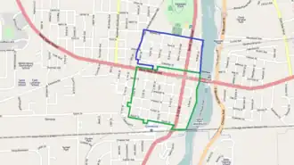 Location of the Central Geneva Historic District (green outline) within Geneva. The adjacent North Geneva Historic District is outlined in blue to the north. | |
