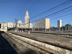 Already in 1870, the station was renovated and enlarged following a project by Jorge Grademaker Grunewald, in order to accommodate the growing number of passengers living in the new suburban districts served by the train. The project preserved the appearance of the old station building with a central building flanked by two large side wings and had a station clock in the centre. From 1876 to 1880, new warehouses were built under the direction of Francisco Pereira Passos.[4] On 21 November 1879, electric lighting was installed in the station as a first for a public building in Brazil.[4] In 1906, one of the wings was destroyed by fire.