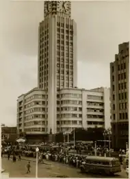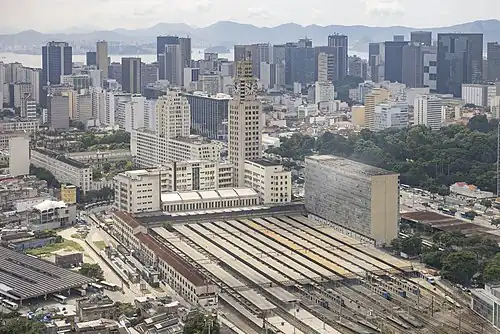 Finally, work on a new station started in 1936. The cornerstone was laid on 29 March 1936, but the project by Roberto Magno de Carvalho was largely modified after the start of the construction. From 1937, the new authoritarian regime in Brazil, the Estado Novo, undertook major works in Rio de Janeiro, in particular the construction of new buildings for public institutions, and the widening and opening of streets, including the creation of the Avenida Presidente Vargas and ambitions for a much larger train station. The task of preparing a new building project for the station was entrusted to the architectural firm of the British architect Robert Prentice which concluded the altered project on 29 November 1937.[4] The old station building was demolished in 1939,[5] and the new station building in Art Deco style (which also served as the seat of the Estrada de Ferro Central do Brasil) opened in 1943,[6] and was completed in 1945.[5]
