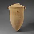 Amphora of coarse white ware | 74.51.2298a, b | Late 7th century BCE | The name "Baalay," indicating ownership or dedication. | RES 1521 | 1826 | Cyprus pl. 9:7; Atlas III, pl. 123:26; Hall 2, XXVI; Peckham, 16–17 |