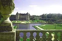 The château has a jardin à la française, redone in 1936–1939, featuring a terrace with an Italian gallery, a monumental stairway, a parterre with four compartments and a fountain, topiary, and statues. The property is entered via the Porte des Lions, an imposing 17th century edifice. Inside the moat is the keep, an ancient machicolated tower.