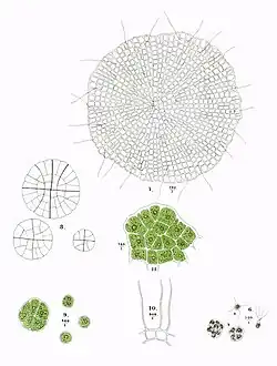 Chaetopeltis is a genus of green algae in the order Chaetopeltidales,[2] containing a single species, Chaetopeltis orbicularis.[3] It is an epiphyte on aquatic plants and filamentous algae. It is a freshwater organism,[4] preferring flowing water;[3] it is generally common but often overlooked.[5]